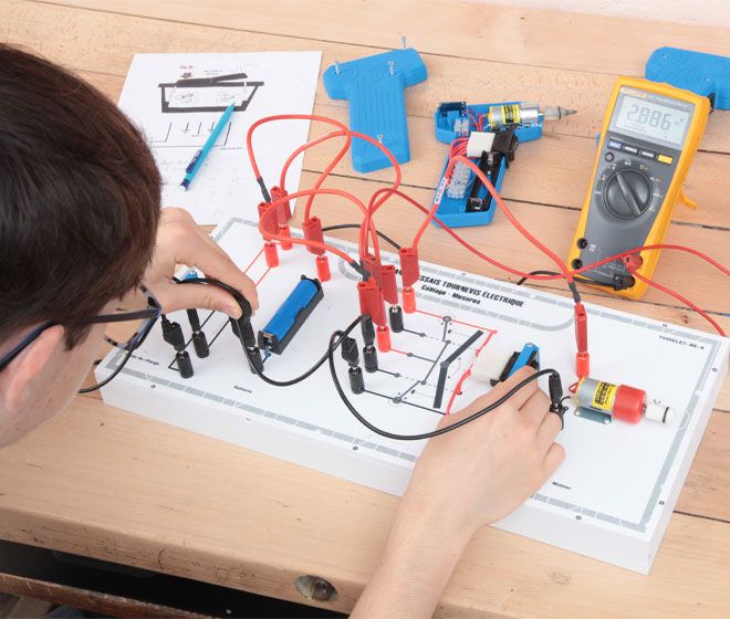 Aux dimensions confortables pour travailler en petit groupe. Pièces et composants placés en ligne pour la lisibilité. Il permet de repérer les blocs fonctionnels, d’étudier et tester le câblage et de faire facilement des mesures avec un multimètre.