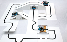 Petit robot évoluant sur des pistes thématiques grâce à une caméra placée dans une tour de contrôle. Programmable avec Blockly