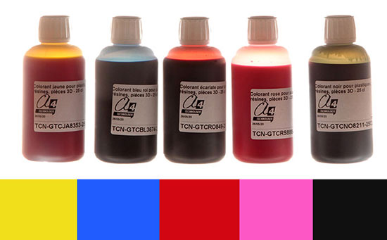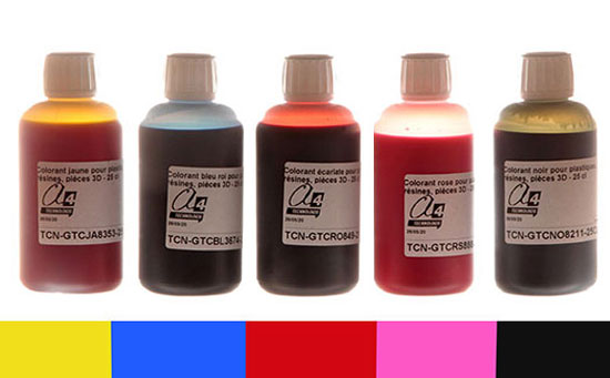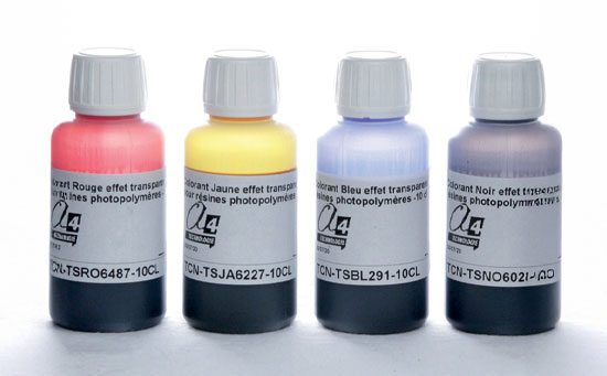 Les teintures permettent de teinter les couches extérieures de pièces déjà fabriquées en résine ou plastique, blanches ou transparentes.