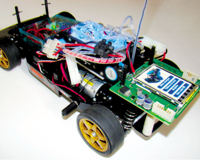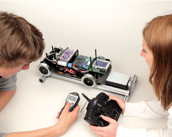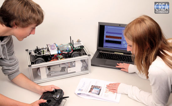 Accompagnée de son banc d'approfondissement, la voiture Tamiya de compétition sur piste, qui embarque des technologies de pointe, constitue une étude visant à optimiser ses performances et à mesurer des écarts avec des modèles comportementaux.