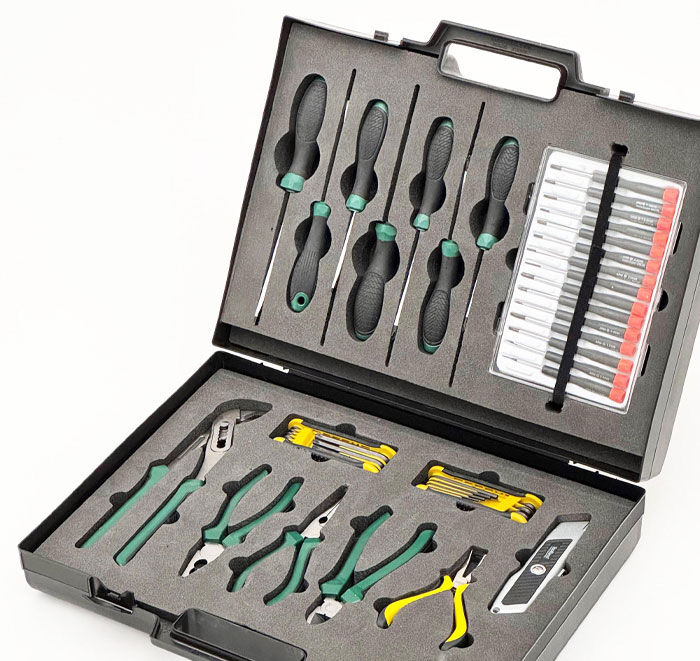 Mallette avec mousse usinée aux empreintes de chaque outil disponible en accessoires - (Réf. : TROUS2-MESURE-COF).75,00 €HTSoit 90,00 €TTC -
