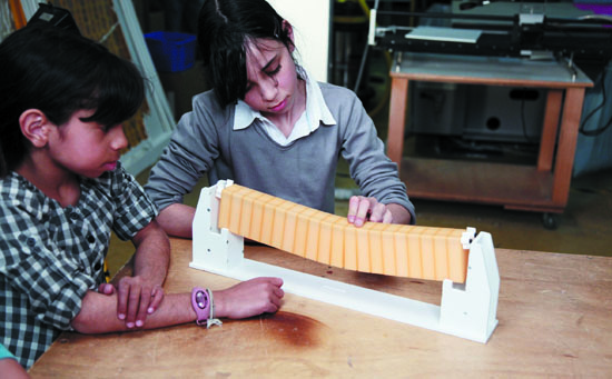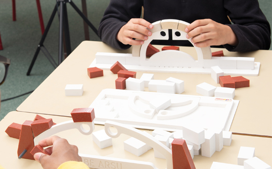 Maquettes expérimentales de structures de type arcs et ponts invitant les élèves à manipuler pour mieux comprendre les notions de stabilité et de forces à l'œuvre.