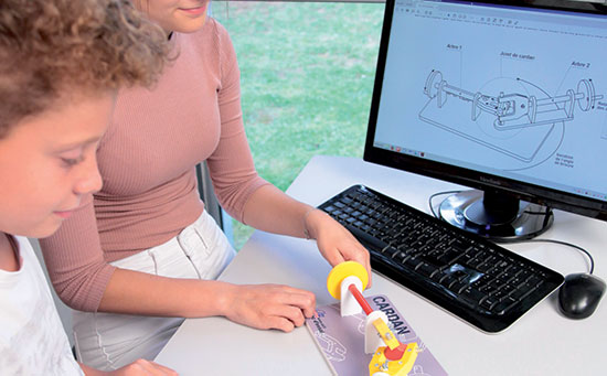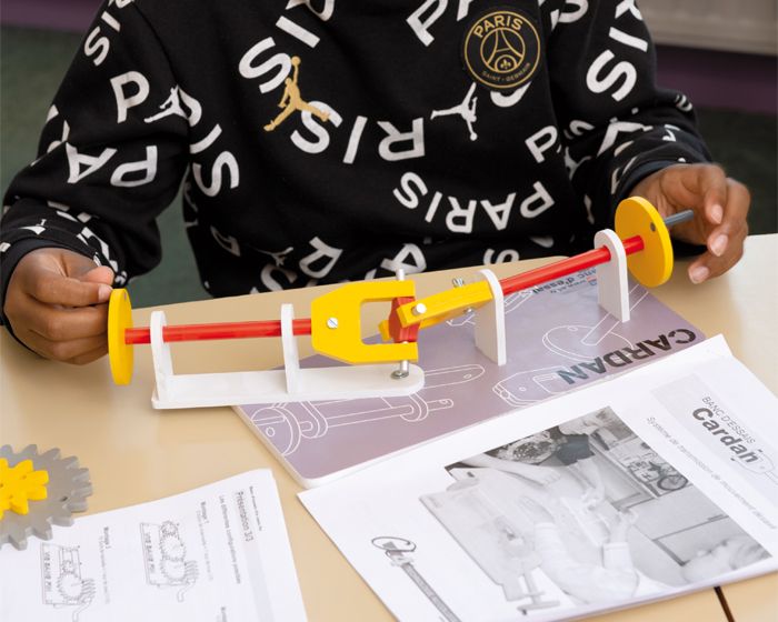 Maquette expérimentale invitant les élèves à monter et démonter un cardan, à le manipuler pour comprendre comment transmettre un mouvement de rotation désaxé.