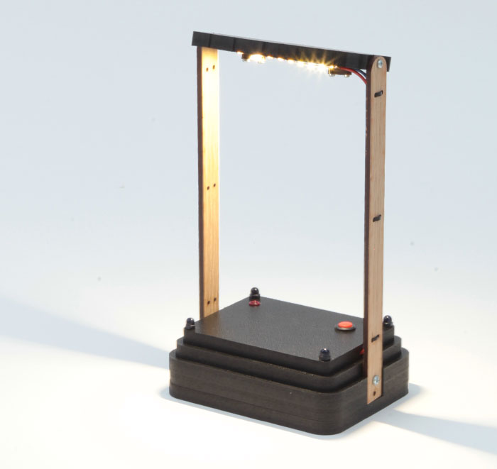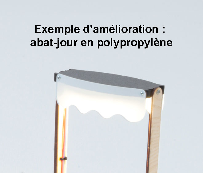 Selon l’équipement de votre lab vous réaliserez tout ou partie de la lampe.Vous pouvez réaliser entièrement la lampe ou bien ne faire réaliser que quelques pièces ainsi que le montage et le câblage. Nous vous proposons les pièces bois déjà découpées (laser) et les pièces plastique du socle usinées et prêtes pour un peu d’ébavurage avant le montage. Les élèves pourront ébavurer et poncer, braser quelques fils, réaliser le câblage, utiliser un multimètre...
