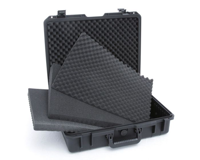Mallette noire, étanche et antichocs, livrée avec 2 mousses de calage prédécoupée et 2 mousses crantées, de dimensions 510 x 410 x 200 mm.