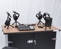 Une Webradio est un support de création de contenus constitué de micros et de casques reliés à une console.