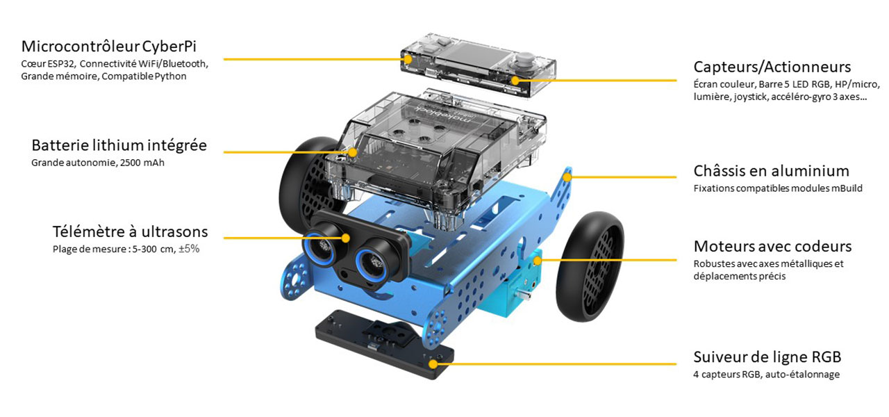 mBot2 associe un châssis métallique de qualité et de hautes performances de codage grâce à un cœur CyberPi ESP32 et ses nombreuses fonctionnalités embarquées :