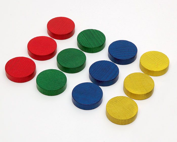Pack de 12 palets Ø52mm en bois, Rouge, Vert, Bleu, Jaune