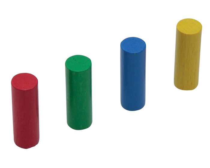 Ce pack d'accessoires pour défis robotiques contient 20 cylindres en bois de couleurs rouge, vert, bleu et jaune.