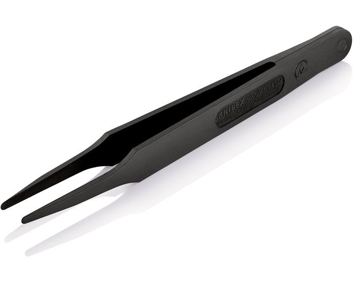 Pince brucelles en plastique ESD, droite, de longueur 115 mm et de largeur de pointe 2 mm, idéale pour une protection maximale des surfaces lors de manipulations de composants électroniques sensibles, de pièces micromécaniques et de composants en verre et en céramique