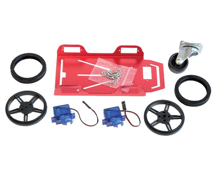 Livré avec une plateforme métallique anodisé rouge, deux mini motoréducteurs CC deux roues de Ø 60 mm, une roue libre de Ø 30 mm et la visserie de montage.