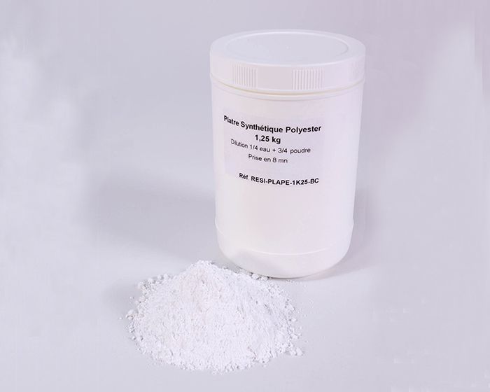 Plâtre additionné d'une base polyester qui le renforce considérablement et le rend insensible à l'eau. Se travaille et s'utilise comme du plâtre mais est beaucoup plus fluide et peut se coulercomme une résine. Donne un matériau très dur. En le colorant correctement, permet de réaliser des fausses pierres, briques ou blocs béton très réalistes.
