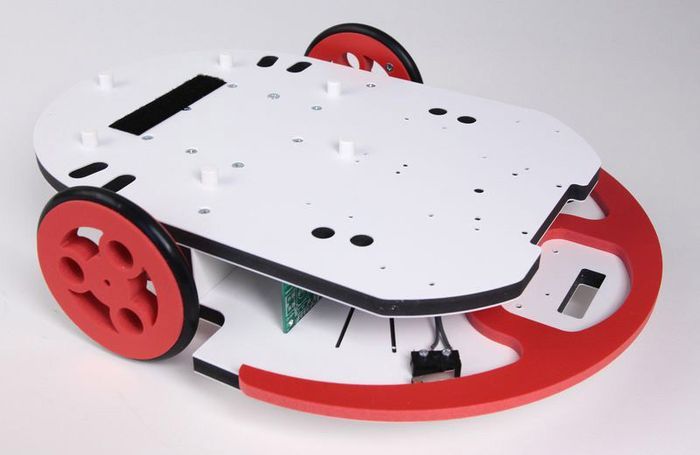 Comprend : la plate-forme à 2 étages pré-équipée avec pare choc + 2 modules microrupteurs, 1 module moteur AutoProg, 2 motoréducteurs + roues, 1 coupleur pour 8 piles AA, 6 cordons 50 cm pour liaison des modules avec le boîtier AutoProg, vis et accessoires.