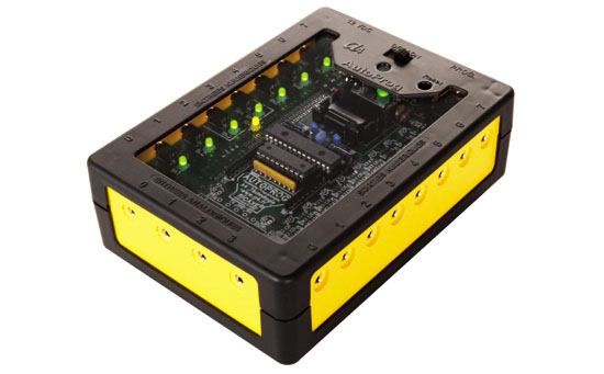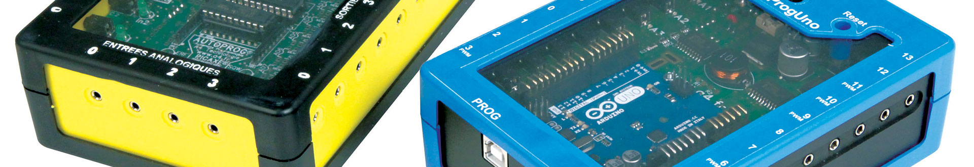 AutoProg est une interface de programmation à connectique rapide disponible en deux versions interchangeables Picaxe (X2) ou Arduino (UNO).