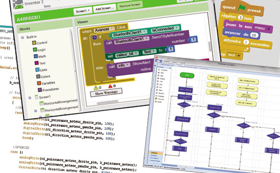 • Programmation : environnements graphiques, en blocs ou textuels tels que Scratch, Editor 6, mBlock, MU Python, Blockly, MakeCode, AppInventor, IDE Arduino (disponibles en local, en ligne, sur application iOS/Android)