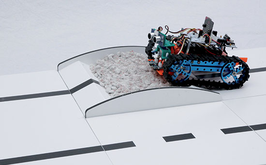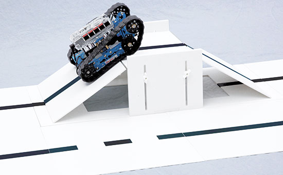 • 6 obstacles destinés à perturber les déplacements des robots : pente réglable, droite ou en virage, pont, bascule, dos d'âne, bac à sable ou à eau