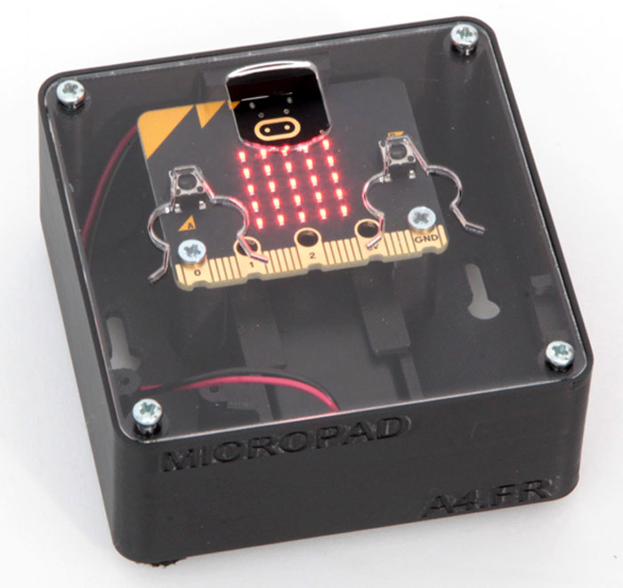microPAD - Pad de jeux avec carte BBC micro:bit - Version montéeRef : MP-MPad de jeu programmable monté, intégrant sa carte BBC micro:bit. Fonctionne seul ou en réseau avec d'autres modules microDÉFI (microPAD, microMOUV, microSCORE). Idéal pour créer des jeux interactifs en classe ou en atelier.