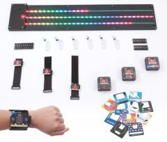- microSCORE est un grand panneau d'affichage avec trois bandes à LED de couleur, programmable bien entendu pour afficher des données issues de ses capteurs (température, bruit, etc.) ou pour recevoir et afficher des informations données par ses cousins : microMOUV et microPAD