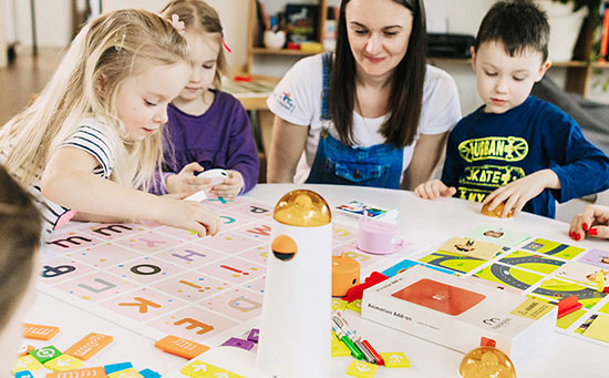 Kit de base Coding set Matatalab pour démarrer l'apprentissage de la programmation sans écran et sans application : le robot programmable Matatabot évolue sur une piste thématique, guidé par des instructions simples (déplacements, séquenc ...