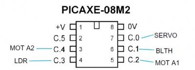 Équipée d’un microcontrôleur PICAXE 08M2 qui dispose de 2 entrées/sorties.