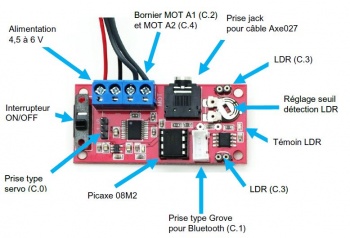 Équipée d’un microcontrôleur PICAXE 08M2 qui dispose de 2 entrées/sorties.
