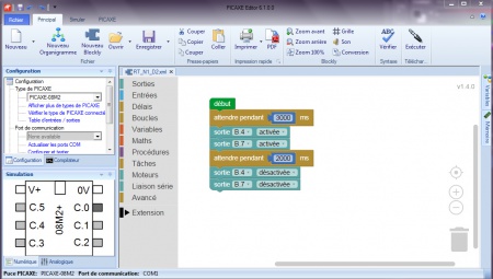 Vous pouvez aussi utiliser Blockly for Picaxe : environnement de programmation par blocs simplifié (nombre de menus limité et personnalisation des entrées/sorties non disponibles).